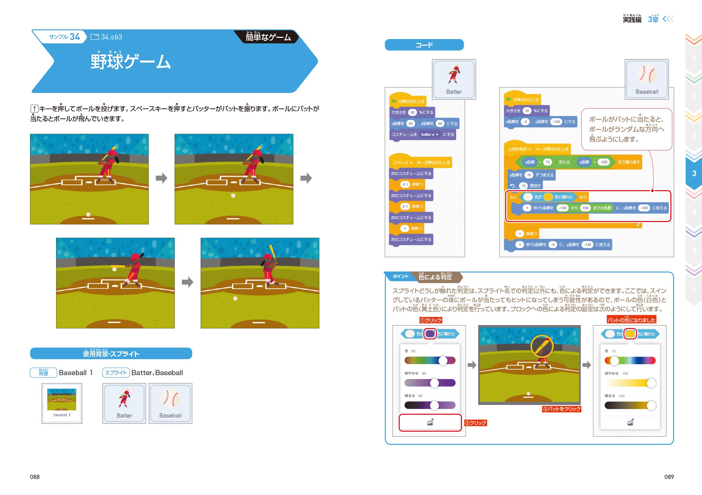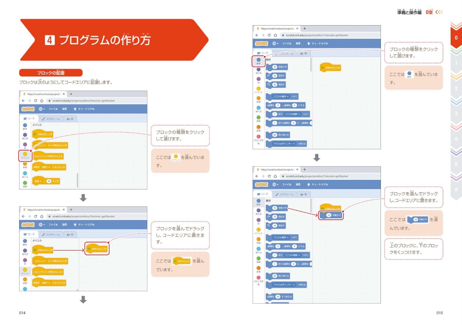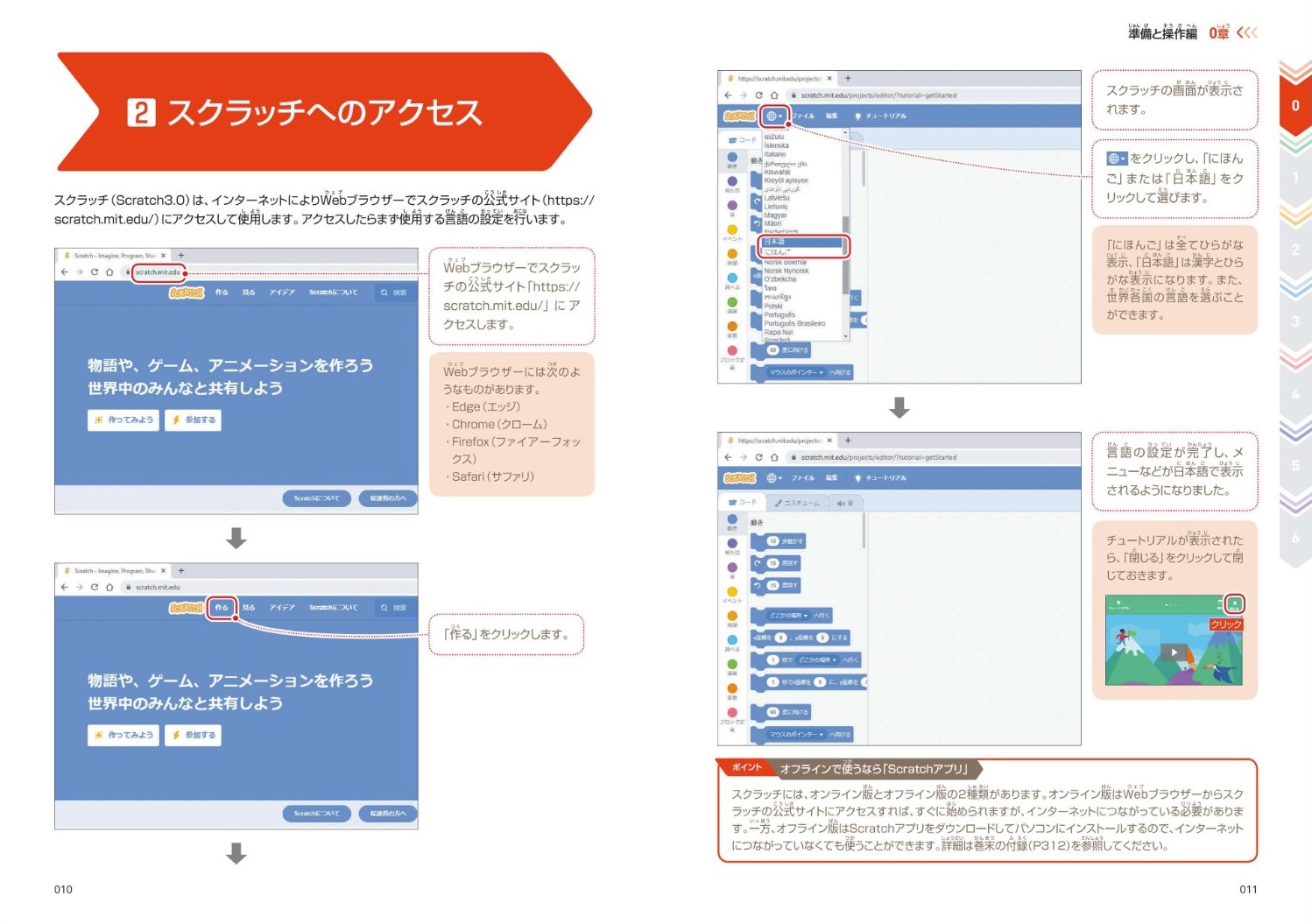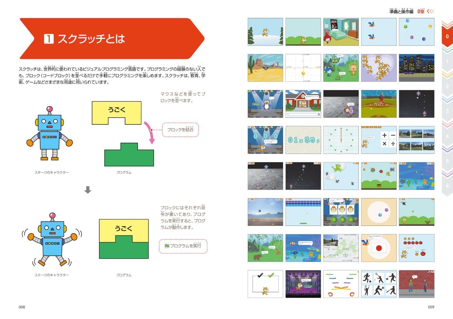 0章では、スクラッチの画面や操作について解説しています。スクラッチの基本操作について学ぶことができます。 1章では、スクラッチの初歩的なプログラミング例について解説しています。スクラッチで使う簡単なアルゴリズムを学ぶことができます。 2章では、スクラッチの基本的なプログラミング例について解説しています。スクラッチでよく使う基本的なアルゴリズムを学ぶことができます。 3章では、スクラッチの実践的なプログラミング例について解説しています。簡単に作れるゲームと便利に使えるものを題材に、スクラッチで実現できることを総合的に学ぶことができます。