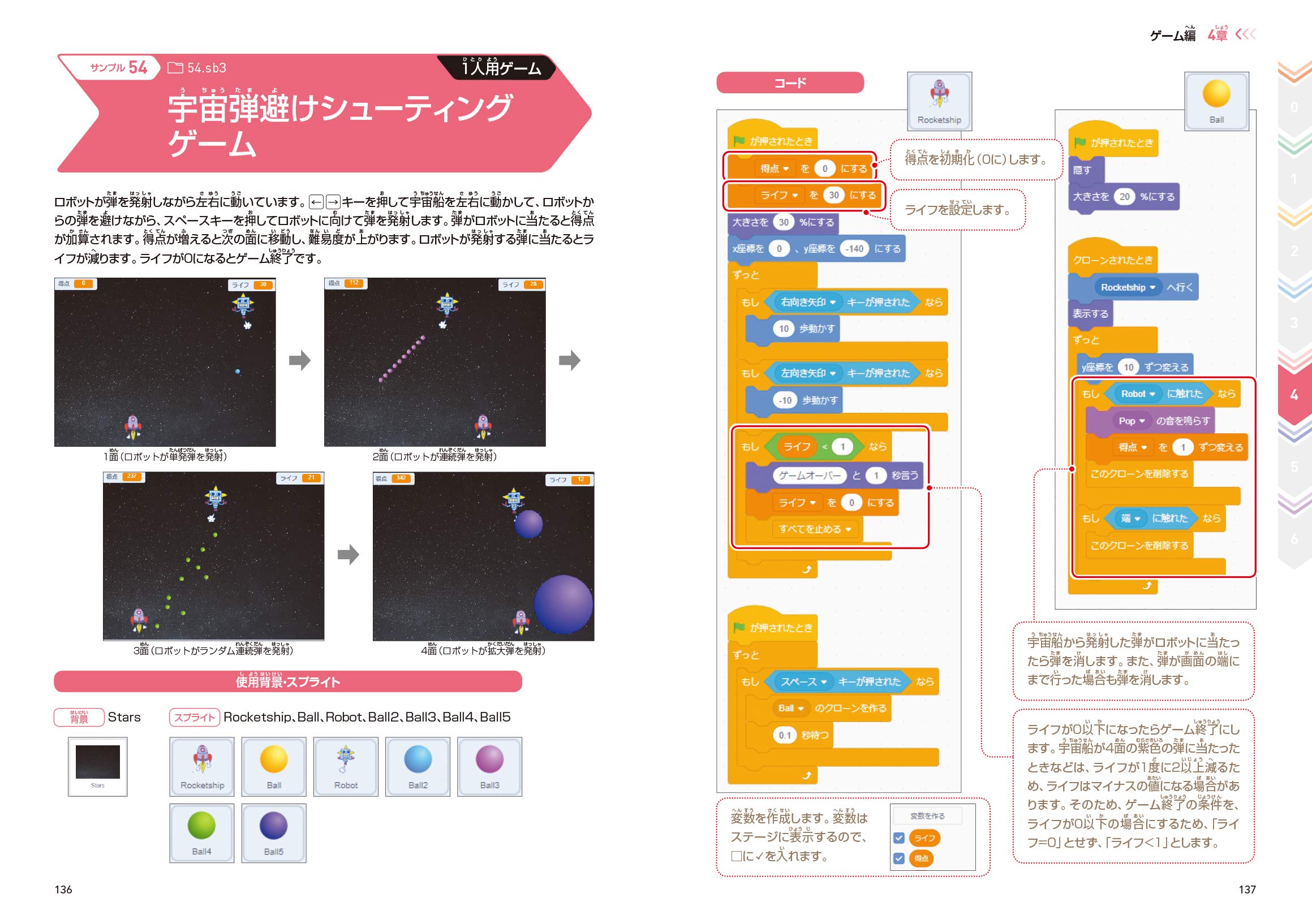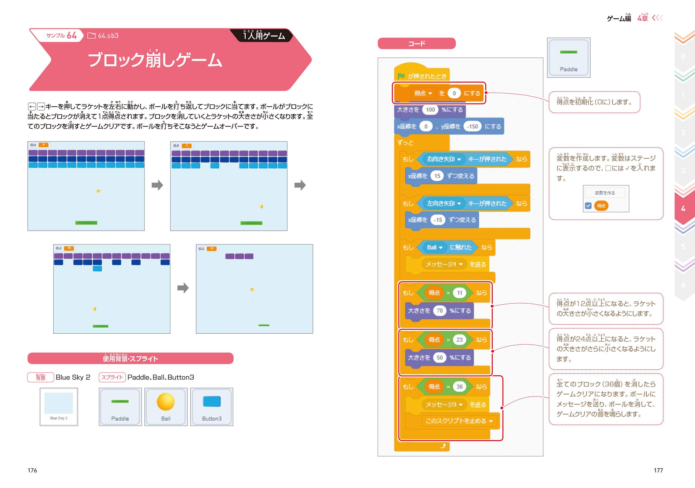 4章では、スクラッチによるゲームプログラミング例について解説しています。様々な種類のゲームを楽しみながら学ぶことができます。 4章のページ(例)
