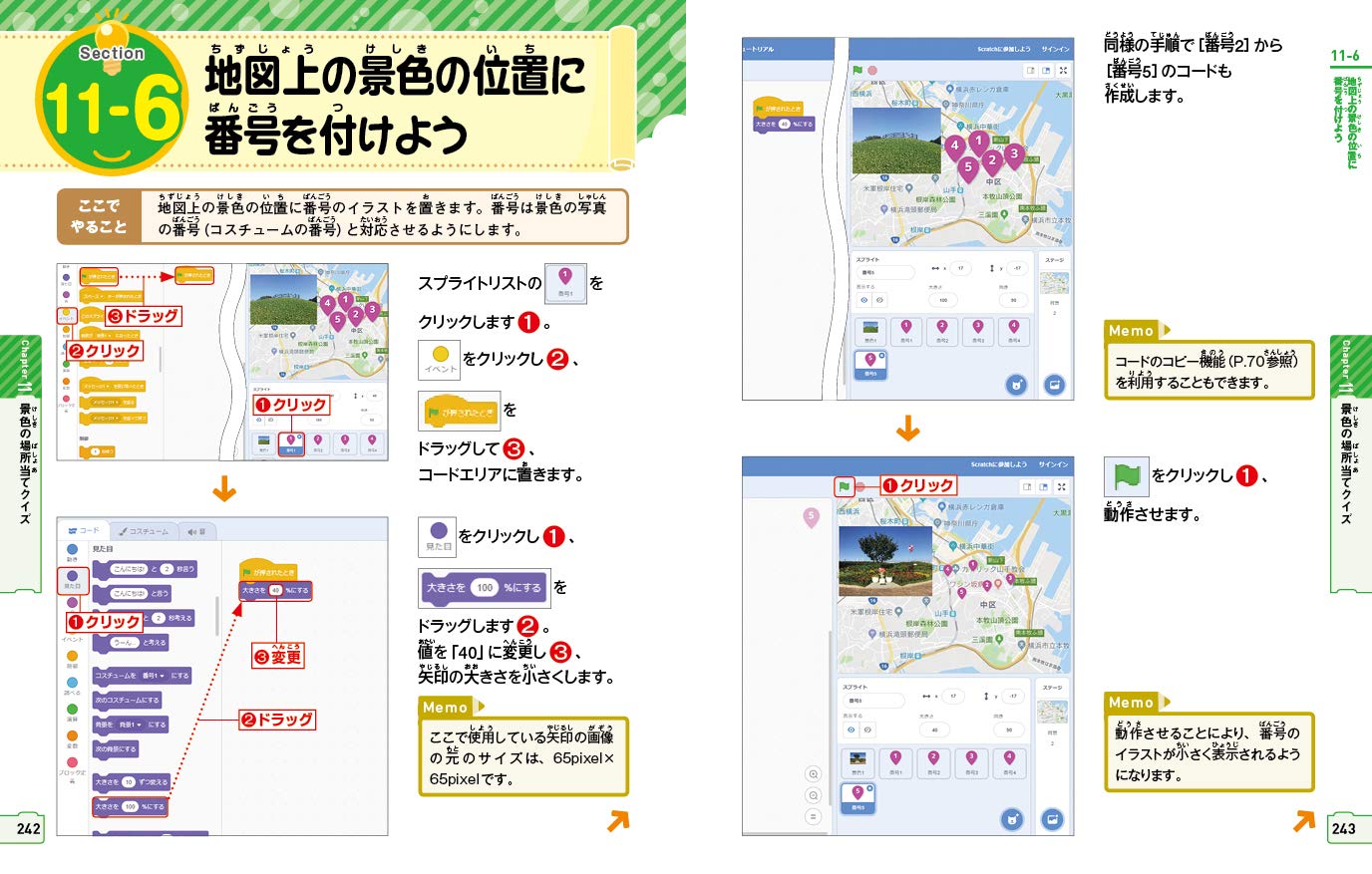 11章から12章では、スクラッチでの素材の利用について解説しています。スクラッチで写真やイラストを使ったプログラミングについて学ぶことができます。