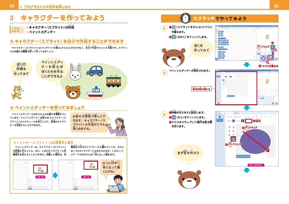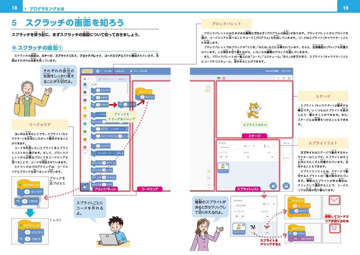 1章から3章では、プログラムおよびプログラミングに関する概念、スクラッチの基本について解説しています。スクラッチの基本操作を楽しくかんたんに学ぶことができます。